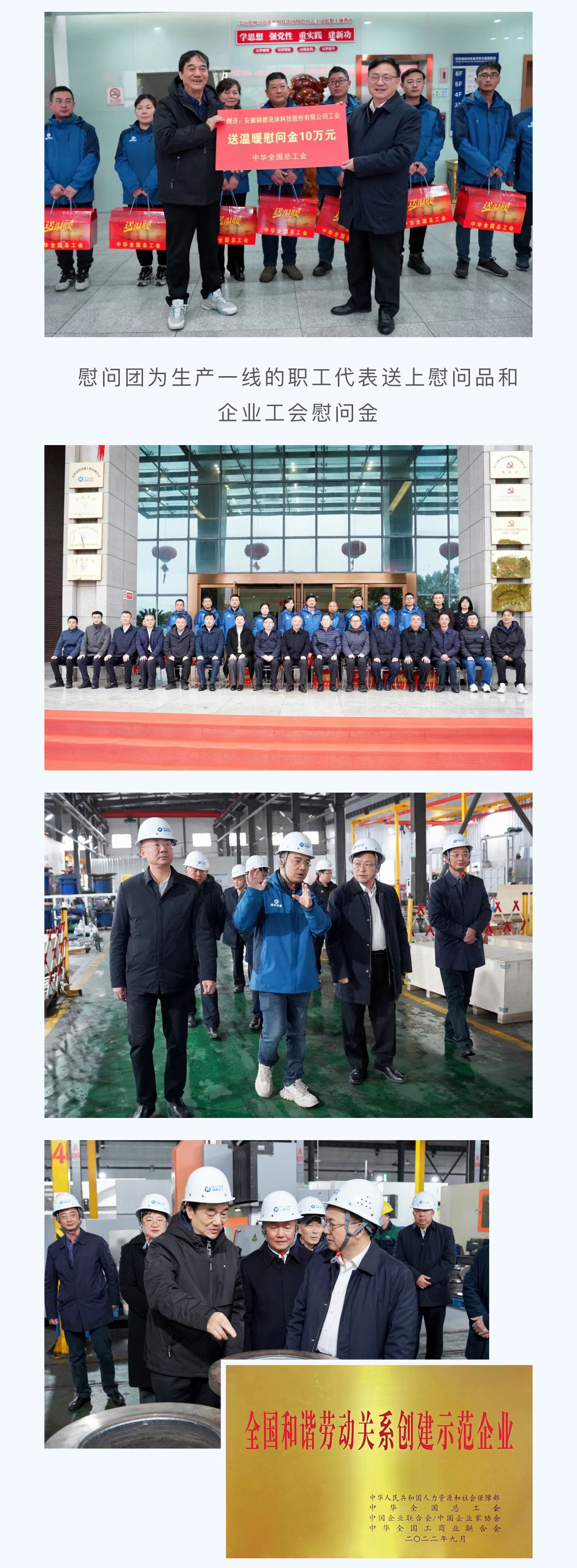 慰問(wèn)團(tuán)一行對(duì)銅都流體獲得“全國(guó)和諧勞動(dòng)關(guān)系創(chuàng)建示范企業(yè)”榮譽(yù)作出充分肯定,并在董事長(zhǎng)楊成、總經(jīng)理?xiàng)盍杞芘阃?,前往生產(chǎn)現(xiàn)場(chǎng),看望奮戰(zhàn)在生產(chǎn)一線的職工代表,為他們送上慰問(wèn)品和企業(yè)工會(huì)慰問(wèn)金,詳細(xì)了解企業(yè)生產(chǎn)經(jīng)營(yíng)和工會(huì)工作情況,指出企業(yè)工會(huì)組織要切實(shí)發(fā)揮作用,圍繞企業(yè)生產(chǎn),積極開(kāi)展各類勞動(dòng)競(jìng)賽和技能素質(zhì)提升活動(dòng),為職工的成長(zhǎng)成才搭建廣闊舞臺(tái),鼓勵(lì)廣大職工要充分發(fā)揮工人階級(jí)主力軍作用,用辛勤的勞動(dòng)創(chuàng)造美好的生活,為推進(jìn)中國(guó)式現(xiàn)代化貢獻(xiàn)自己的力量。